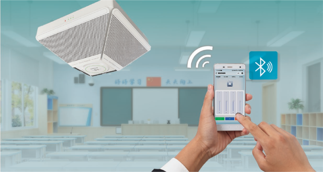 智慧教室均衡擴(kuò)聲系統(tǒng)從根本上改善教室聲環(huán)境,保護(hù)聽力健康。系統(tǒng)支持手機(jī)APP調(diào)整配置。首次使用時,直接在手機(jī)APP進(jìn)行設(shè)置、配網(wǎng)、音箱配置等功能,既能自主配置教室聲壓級在一個安全、合理、健康的范圍內(nèi),同時也能減少用戶學(xué)習(xí)成本,簡單易操作。系統(tǒng)支持藍(lán)牙音源輸入和線路音源輸入,滿足教學(xué)一體機(jī)的多媒體擴(kuò)聲需求,能兼容多種設(shè)備,比如老師通過連接藍(lán)牙,就能播放手機(jī)里的音源資源,豐富課堂互動與交流,提升授課效果。系統(tǒng)還配置了無線話筒對頻使用,操作簡單,即連即用,搭配IP智能均衡音箱實現(xiàn)本地擴(kuò)聲,老師在“自然聲”狀態(tài)下就能實現(xiàn)傳播音質(zhì)清晰柔和,告別以往“喊嗓子”。系統(tǒng)尊重和關(guān)注教師的身體健康,讓廣大教師能安心從教、舒心從教、靜心從教,倡導(dǎo)各位老師們“一師一麥”,注意個人衛(wèi)生防護(hù)。