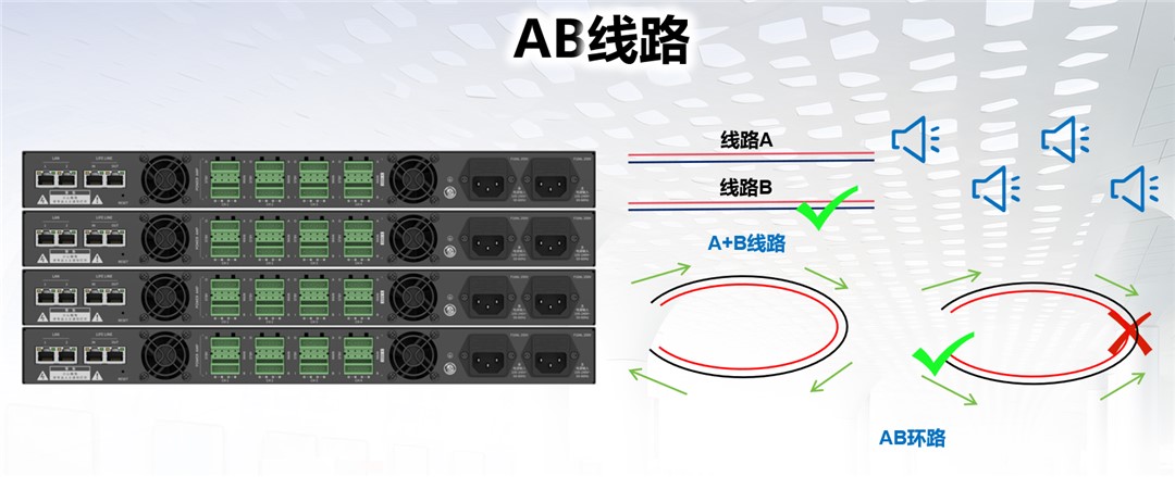 目前大型工程中廣泛采用的是“N+1”或“1+1”主備功放切換機制。在這種架構(gòu)下,除了負責(zé)各個防區(qū)日常發(fā)聲的主干功放群“N”之外,機房內(nèi)還會額外部署一臺或多臺處于待機狀態(tài)的備用功放“1”。系統(tǒng)中的主備切換器會像極其敏銳的“心臟監(jiān)護儀”一樣,全天候?qū)崟r偵測所有主功放的工作狀態(tài)。