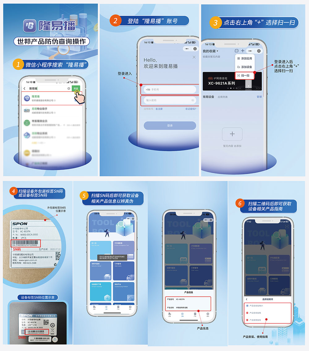 您可以通過(guò)手機(jī)微信搜索并打開(kāi) “世邦隆易播”小程序,使用小程序內(nèi)的“掃碼”功能,掃描產(chǎn)品標(biāo)簽上的 SN碼,即可快速、準(zhǔn)確地查詢產(chǎn)品的真?zhèn)涡畔⒓吧a(chǎn)溯源信息,有效保障您的權(quán)益。