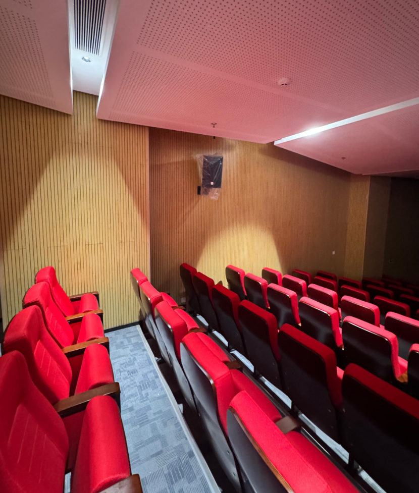 參考報(bào)告廳現(xiàn)有的木質(zhì)吸音飾面與紅色座椅的典雅風(fēng)格,我們的設(shè)備選型注重“視覺隱身”。黑色的線陣列音箱與深色舞臺(tái)背景融為一體,小巧的補(bǔ)聲壁掛音箱融入側(cè)墻設(shè)計(jì),不破壞原有的裝修美感。這種設(shè)計(jì)理念讓觀眾的注意力完全聚焦于舞臺(tái)中央的高清LED大屏,實(shí)現(xiàn)視聽體驗(yàn)的純粹性。